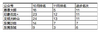 “客侨凤岗”11月排名下降最严重,从上月前十名跌至本月的二十名开外。纵观该公众号近几月的排名数据,上下起伏较大,因此应继续注重推文质量的提升,也可考虑举办些互动性高的活动,为公众号积攒固定粉丝。“虎门太平”的排名跌幅同样较大,从上月的前三名跌至本月的第15名,稍显遗憾。排名下跌6个名次的“东莞南城发布”和“幸福松山湖”,也应有所警惕。