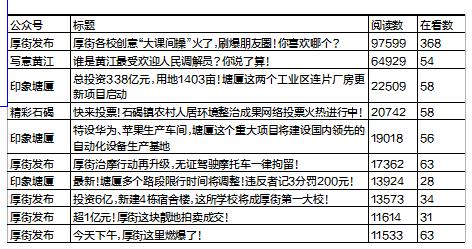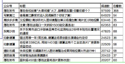 记者还注意到,此次上榜的原创文章里面,投票类文章相比以往有所增多。包括《厚街各校创意“大课间操”火了,刷爆朋友圈!你喜欢哪个?》《谁是黄江最受欢迎人民调解员?你说了算!》《快来投票!石碣镇农村人居环境整治成果网络投票火热进行中!》,均涉及到投票。而投票有两个显而易见的好处,一是公众号涨粉,二是增强互动。从这三篇投票类文章来看,《厚街各校创意“大课间操”火了,刷爆朋友圈!你喜欢哪个?》阅读量最高,将近十万。而这也与该文章的受众范围广、更接地气有关系。