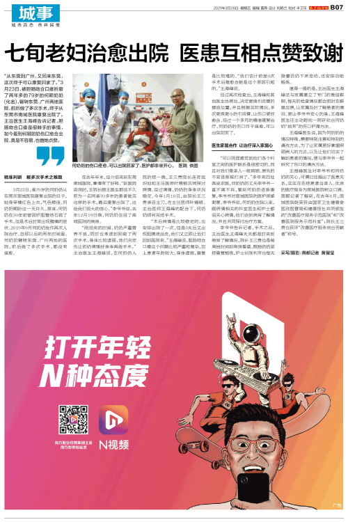 何奶奶的伤口痊愈,可以出院回家了,医护都非常开心。 医院 供图 “从东莞到广州,又回来东莞,这次终于可以康复回家了。”3月23日,被胆肠吻合口瘘折磨了两年多的79岁的何颖奶奶(