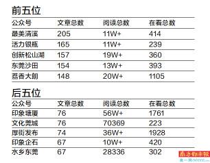 从榜单后五位来看,“印象塘厦”“文化莞城”“厚街发布”“印象企石”以及“水乡东莞”这五个公众号排名垫底。记者还注意到,排在榜单后五位的公众号,阅读总数甚至高达56万+,在看总数也有将近2000,传播效果相对较好。尤其是“印象塘厦”公众号,阅读总数和在看总数都相对较高。今后若能持续提高文章发布数量,公众号的影响力也将大大增强。