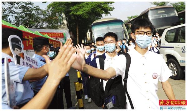 6月7日,东莞中学初中部考场外,现场的工作人员与考生们击掌,给他们加油鼓劲。 南都记者 刘媚 摄
