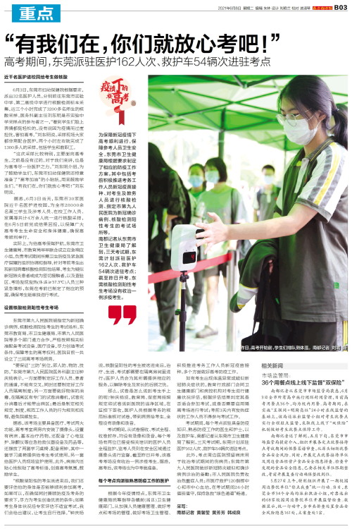 为保障新冠疫情下高考顺利进行,保障参考人员卫生安全,东莞市卫生健康局根据要求制定了相应的防疫工作方案。其中包括考前积极推进考务工作人员新冠疫苗接种、对考生及教务人员进行核酸检测、指定市第九人民医院为新
