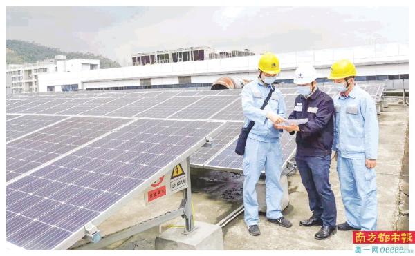 6月23日,东莞南区供电局大岭山供电服务中心为企业检查光伏组件运行情况,指导保养维护知识,确保企业用电质量。 叶智德 摄