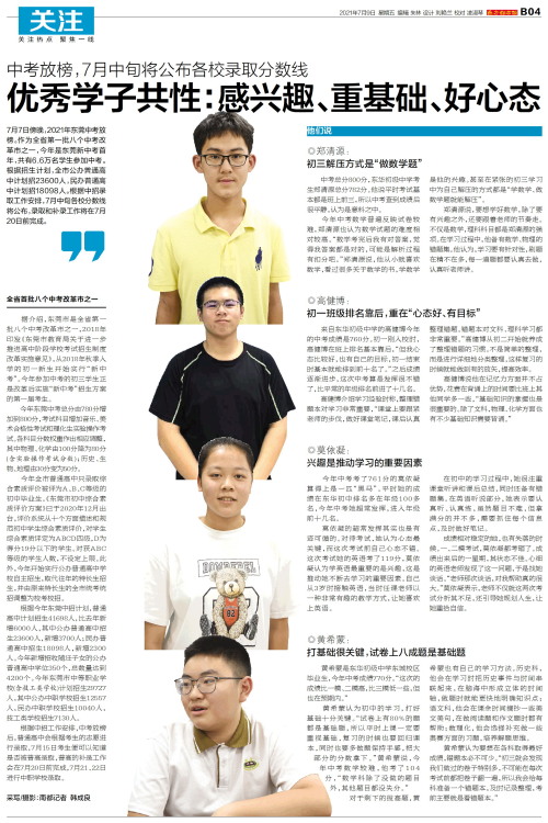 来自东华初级中学的高健博今年的中考成绩是760分。初一刚入校时,高健博在班上排名基本靠后,“但我心态比较好,也有自己的目标,初一结束时基本就能排到前十名了。”之后成绩逐渐进步,这次中考算是发挥很不错了,比平常的年级排名前进了十几名。