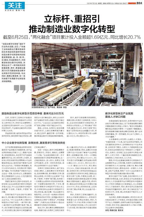 东莞慕思数字化工厂生产车间。 黄剑峰 供图 “制造业数字化转型”是时下行业热点话题。近日,广东省工业和信息化厅要求各地市结合本地实际抓紧研究制定制造业数字化转型相关的配