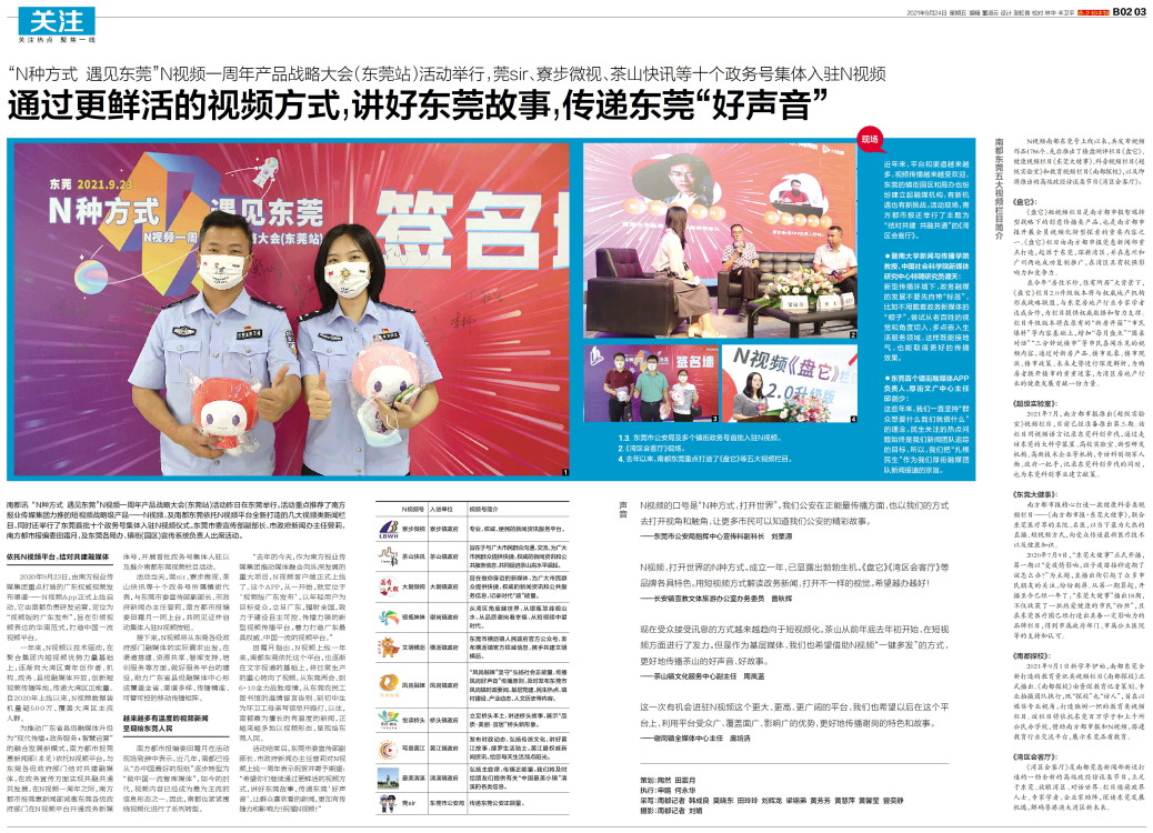 南都讯 “N种方式 遇见东莞”N视频一周年产品战略大会(东莞站)活动昨日在东莞举行。活动重点推荐了南方报业传媒集团力推的短视频战略级产品——N视频,及南都东莞依托N视频平台全新打造的几大视频类新闻