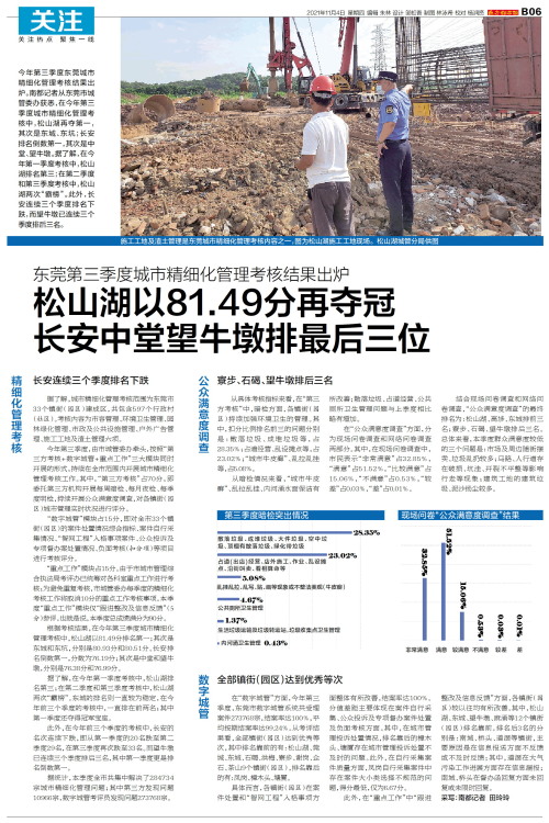 今年第三季度东莞城市精细化管理考核结果出炉。南都记者从东莞市城管委办获悉,在今年第三季度城市精细化管理考核中,松山湖再夺第一,其次是东城、东坑;长安排名倒数第一,其次是中堂、望牛墩。据了解,在今年