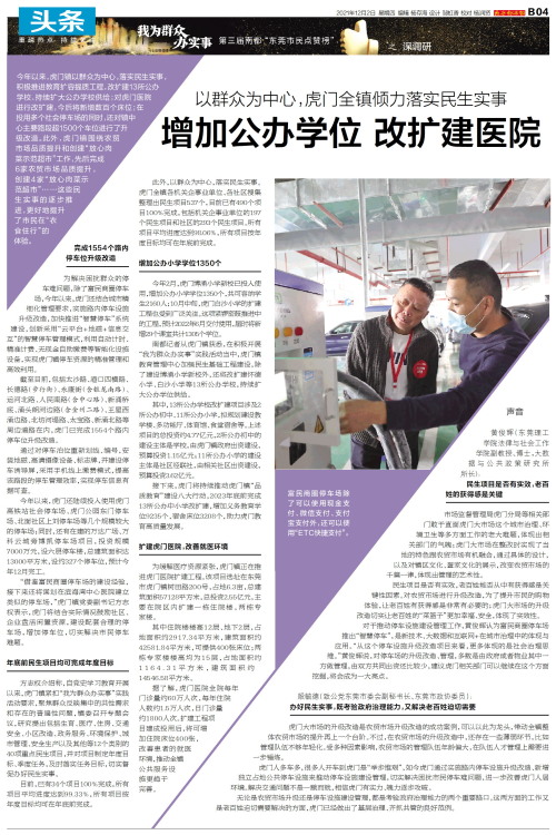 今年以来,虎门镇以群众为中心,落实民生实事,积极推进教育扩容提质工程,改扩建13所公办学校、持续扩大公办学校供给;对虎门医院进行改扩建,今后将新增数百个床位;在投用多个社会停车场的同时,还对镇中心