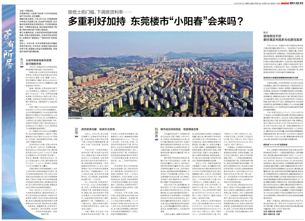 莞有所居之综述 又是一年春来到。 东莞楼市的“小阳春”何时来?对于此时的房地产行业而言,至关重要。 南都记者注意到,今年3月13日,东莞首批集中供地正式挂牌上线。与此前不同的是,此次集中供地