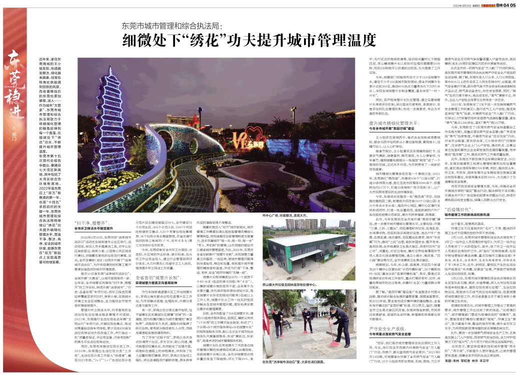 部门 近年来,家住东莞南城的王小姐发现,街道越发整洁、绿化越来越美,经常在转角处就能遇到别致的风景,而夜幕降临后的东莞也更加璀璨、迷人……作为城市“大管家”,东莞市城市管理和综合执法局致力于将