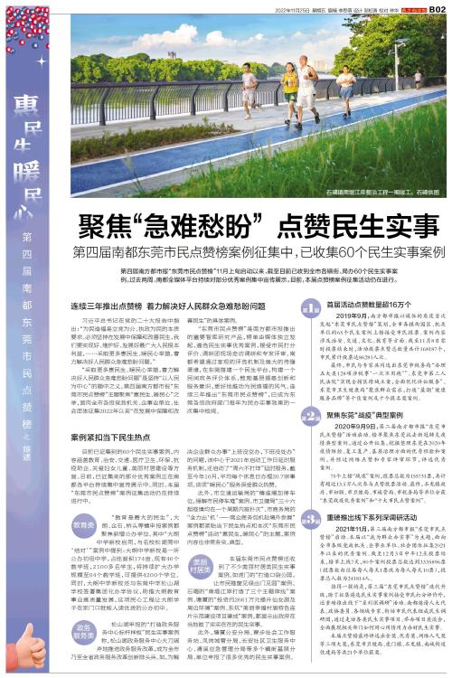 综述 第四届南方都市报“东莞市民点赞榜”11月上旬启动以来,截至目前已收到全市各镇街、局办60个民生实事案例。过去两周,南都全媒体平台持续对部分优秀案例集中宣传展示。目前,本届点赞榜案例征集活