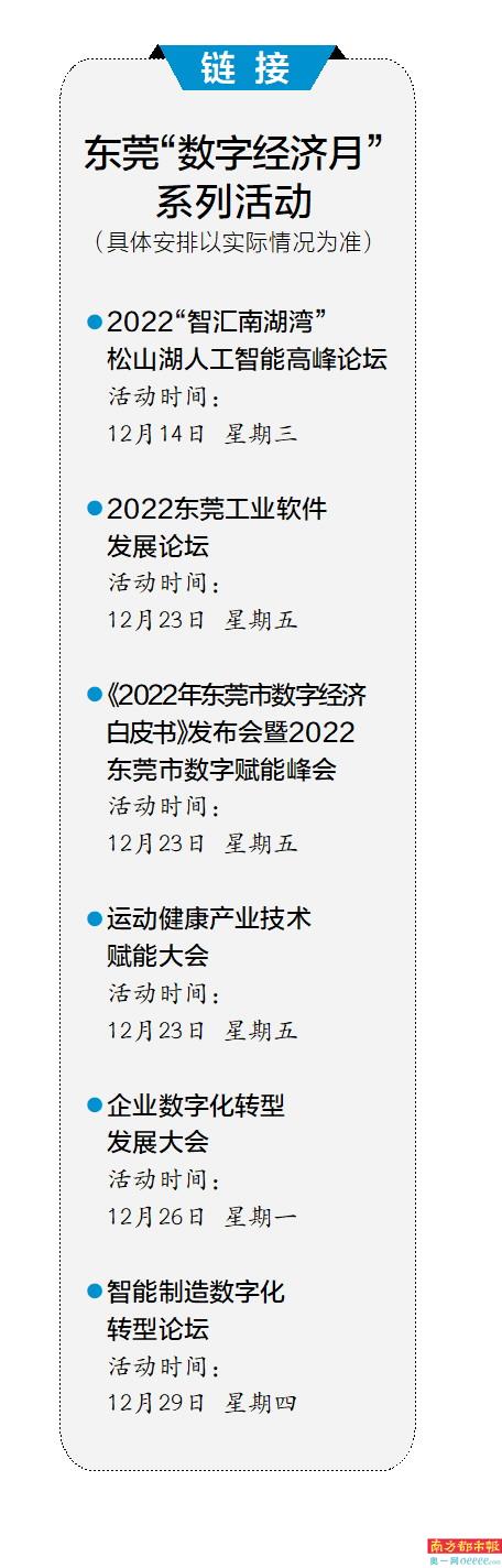 2022年东莞“数字经济月”系列活动包括2022“智汇南湖湾”松山湖人工智能高峰论坛、2022东莞工业软件发展论坛、中国国际运动健康可穿戴技术与产业发展大会等一系列行业性沙龙论坛活动,将在12月期间持续“上新”。