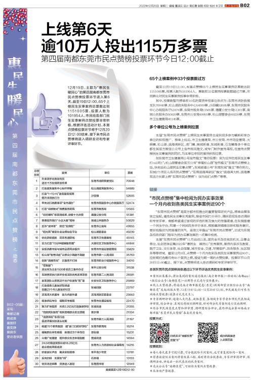 之 动态 12月19日,主题为“惠民生 暖民心”的第四届南都东莞市民点赞榜投票环节进入第6天。截至19日12:00,65个上榜民生实事案例总票数达到1151005票,投票人数为101954人,市