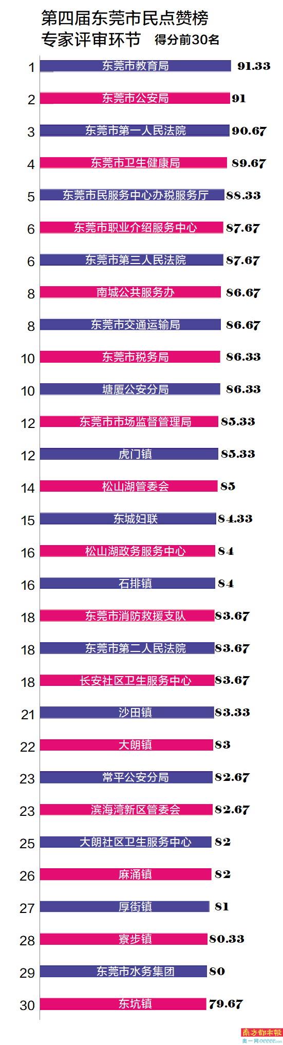 评审团围绕各入围案例的典型性、创新性、便民性、可操作性(可复制性)等标准展开,每个案例总分100分。评审环节,东莞市教育局集团化办学案例得评91.33排名第一;东莞市公安局、东莞市第一人民法院、东莞市卫生健康局、东莞市民服务中心办税服务厅案例得分排名进入前五。