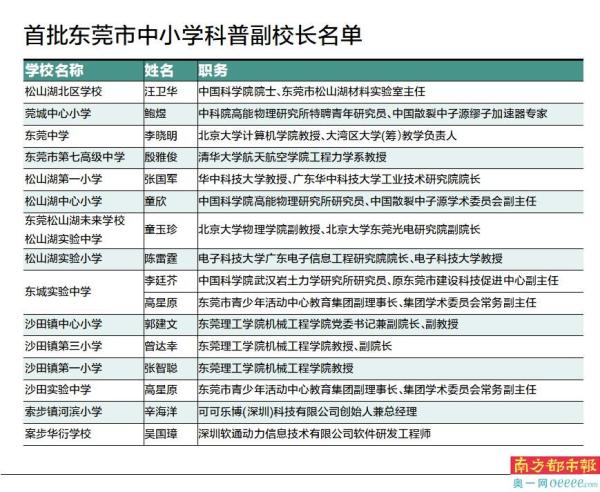 目前,东莞第一批16所中小学校科普副校长已确定,由科学家、高等院校和科研机构专家学者、企业工程师等科技工作者担任,汪卫华、鲍煜、李晓明、李廷芥等均在列。