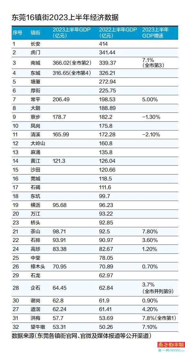 除了南城,东城也公布了部分主要的经济数据。今年上半年,东城实现GDP316.65亿元,总量居全市第四。不过,长安、虎门、厚街、塘厦、大朗、凤岗等去年经济总量排名前十的镇街,均暂未公布经济数据。