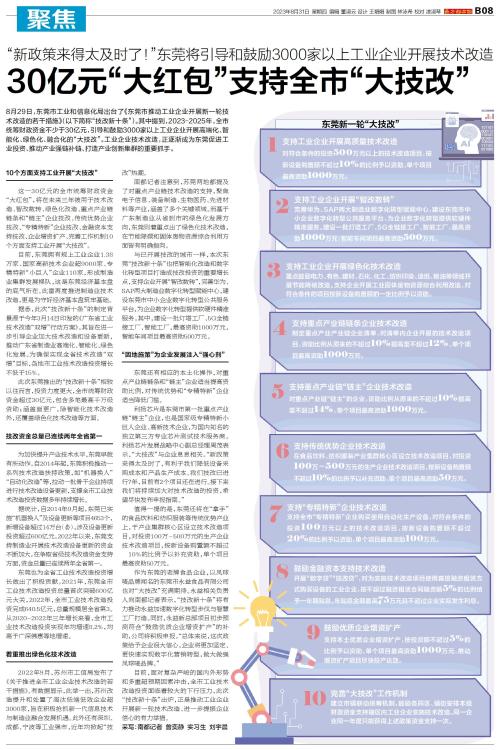 8月29日,东莞市工业和信息化局出台了《东莞市推动工业企业开展新一轮技术改造的若干措施》(以下简称“技改新十条”)。其中提到,2023-2025年,全市统筹财政资金不少于30亿元,引导和鼓励300