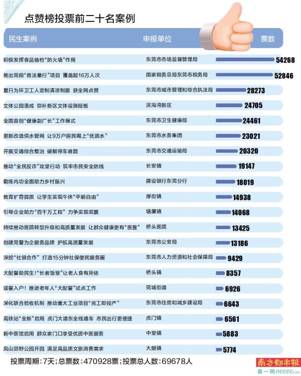 第五届南都东莞市民点赞榜投票环节(12月20日至12月27日)昨日圆满结束。60个民生实事案例上榜接受市民点赞投票,7天时间内榜单投票总数达470928票,投票总人数为69678人。东莞市市场监督管理局、国家税务总局东莞市税务局、东莞市城市管理和综合执法局、滨海湾新区、东莞市卫生健康局得票数列榜单前五。