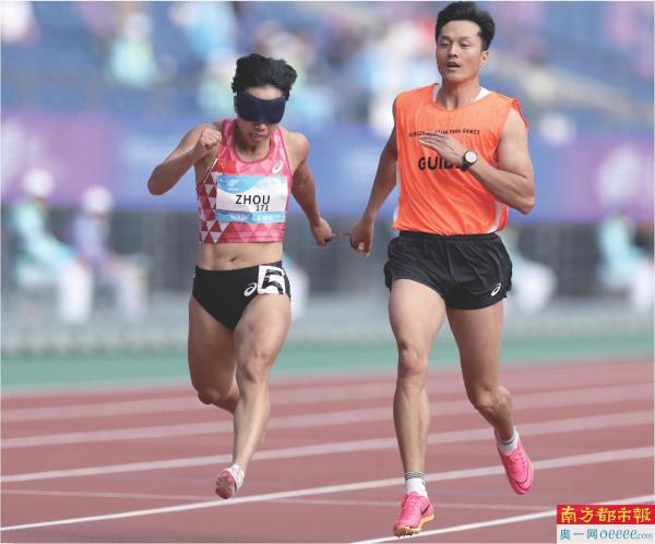 胡正观的弟子周国华与领跑员贾登璞在杭州亚残运会的比赛中奋力奔跑。他们手中是一条“东莞造”引跑绳。