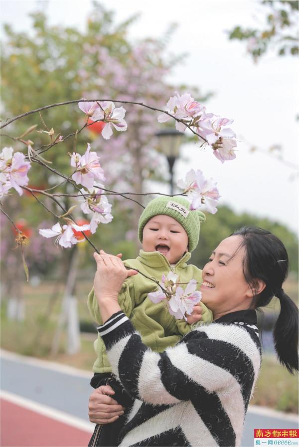 早春二月,南方草长莺飞时节,东莞已是万紫千红,满城莞香,尽显美丽、浪漫的一面,不少市民游客纷纷迎春踏青。市区最大公园同沙生态园,映翠湖畔的宫粉紫荆竞相绽放,游客刘女士带着年幼的外孙一起赏花,数花瓣、嗅花香,玩得不亦乐乎。
