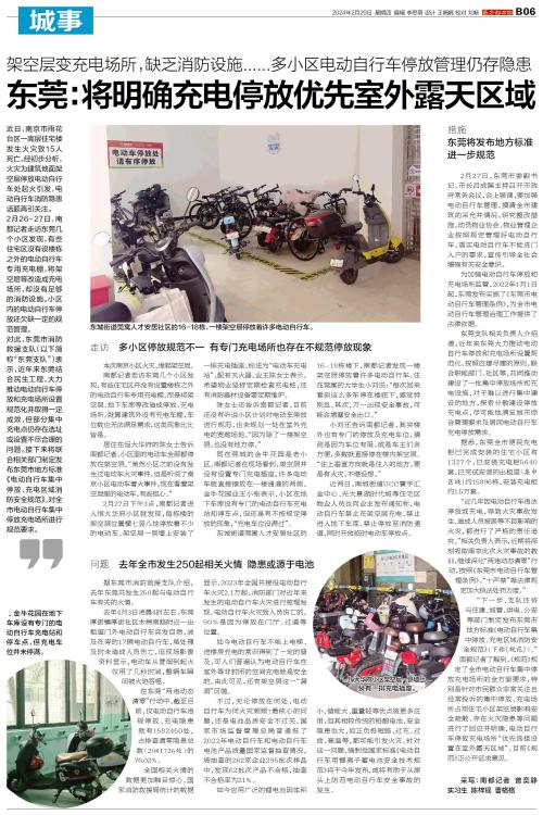 近日,南京市雨花台区一高层住宅楼发生火灾致15人死亡。经初步分析,火灾为建筑地面架空层停放电动自行车处起火引发,电动自行车消防隐患话题再引关注。 2月26-27日,南都记者走访东莞几个小区发现,