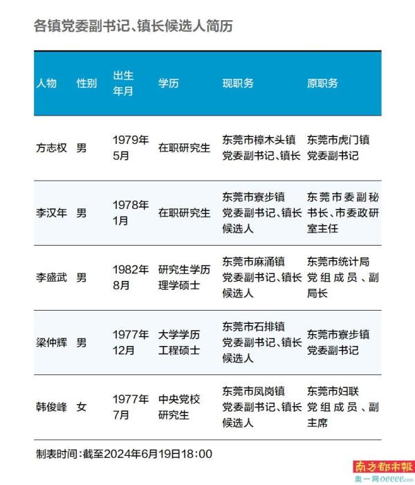 截至6月19日18:00,东莞樟木头、寮步、凤岗、石排、麻涌等5个镇街已在官网更新了党委副书记、镇长候选人的简历。南都记者梳理发现,新到任的镇长(候选人)均年富力强、工作经验丰富,既有来自东莞市委、市府工作部门及下属单位,还不乏东莞对口扶贫、援疆等工作经历。