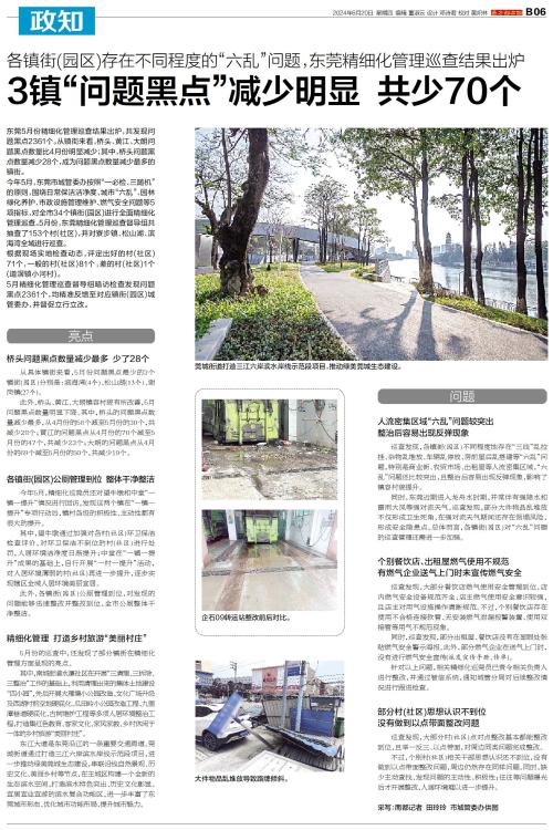 东莞5月份精细化管理巡查结果出炉,共发现问题黑点2361个。从镇街来看,桥头、黄江、大朗问题黑点数量比4月份明显减少;其中,桥头问题黑点数量减少28个,成为问题黑点数量减少最多的镇街。 今年5月