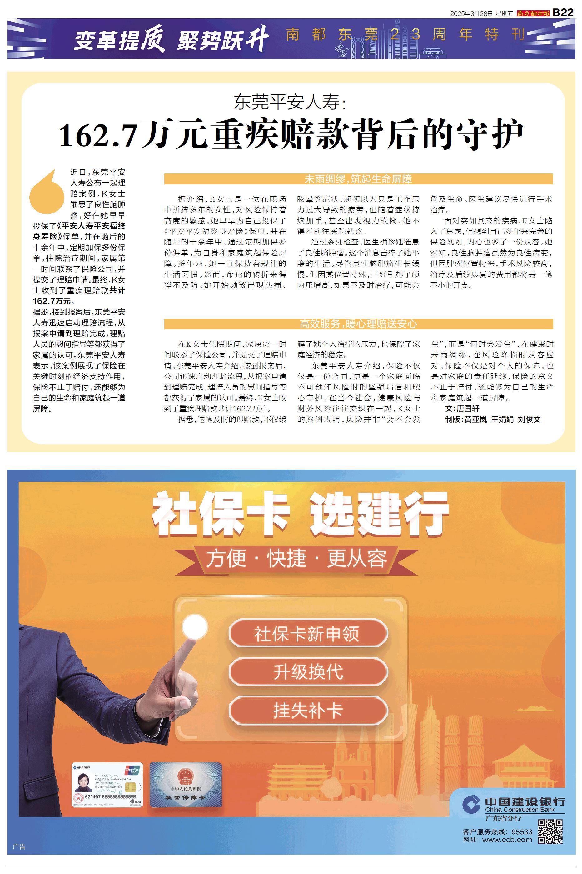 近日,东莞平安人寿公布一起理赔案例,K女士罹患了良性脑肿瘤,好在她早早投保了《平安人寿平安福终身寿险》保单,并在随后的十余年中,定期加保多份保单,住院治疗期间,家属第一时间联系了保险公司,并提交了