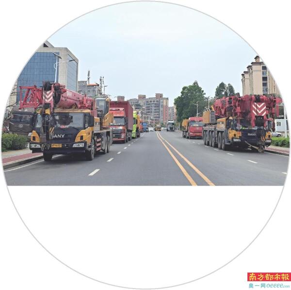 上底村辖区有多家制造业、仓储物流、电子等类型企业,外界车辆特别是大型货车等车辆往来频繁,不少企业就设在上中路沿街。在该路段,可见数辆大型吊机、泥头车违停在道路两侧,原本双向四车道的道路仅剩下两车道。