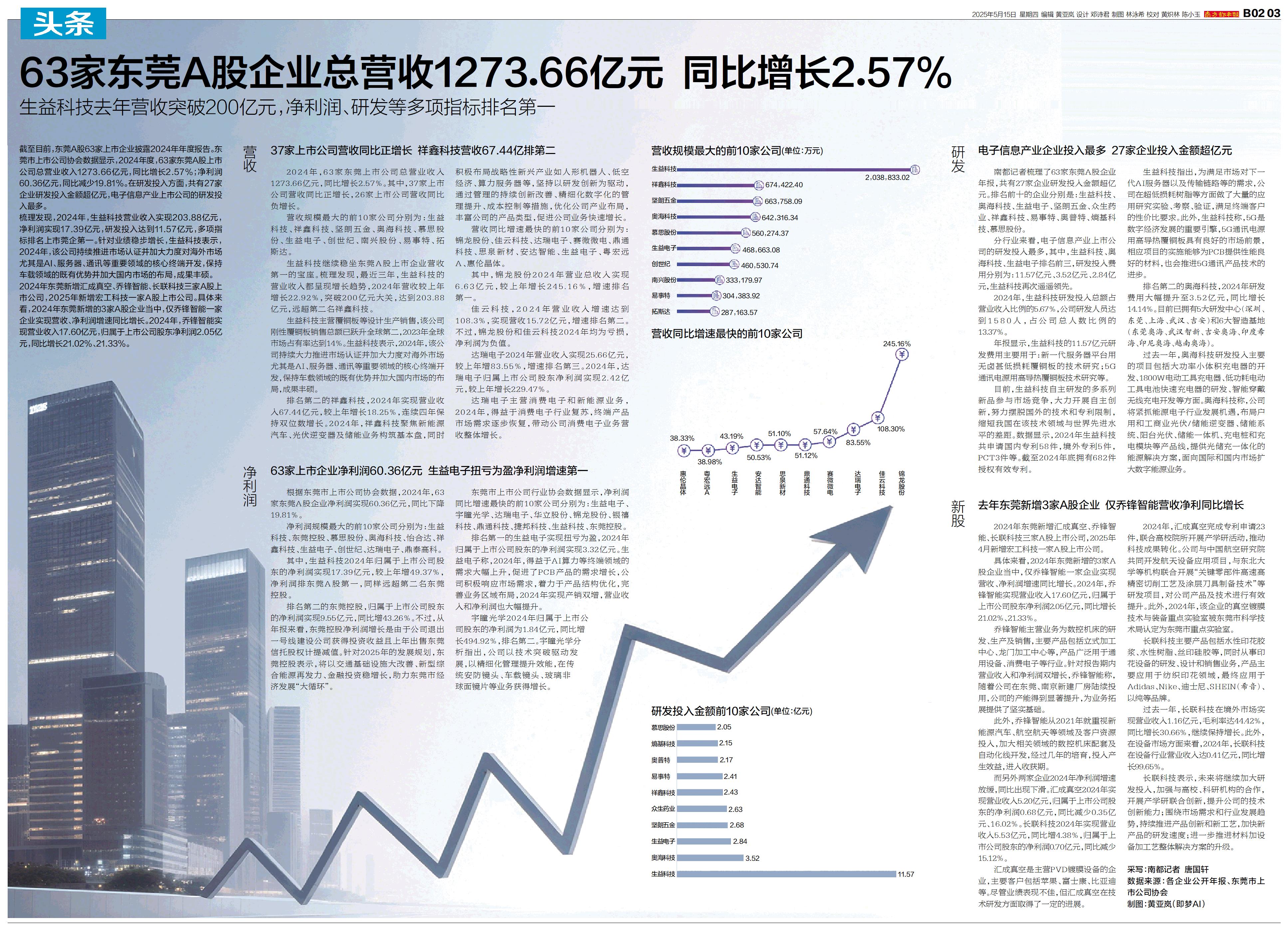 截至目前,东莞A股63家上市企业披露2024年年度报告。东莞市上市公司协会数据显示,2024年度,63家东莞A股上市公司总营业收入1273.66亿元,同比增长2.57%;净利润60.36亿元,同比减少19.81%。在研发投入方面,共有27家企业研发投入金额超亿元,电子信息产业上市公司的研发投入最多。