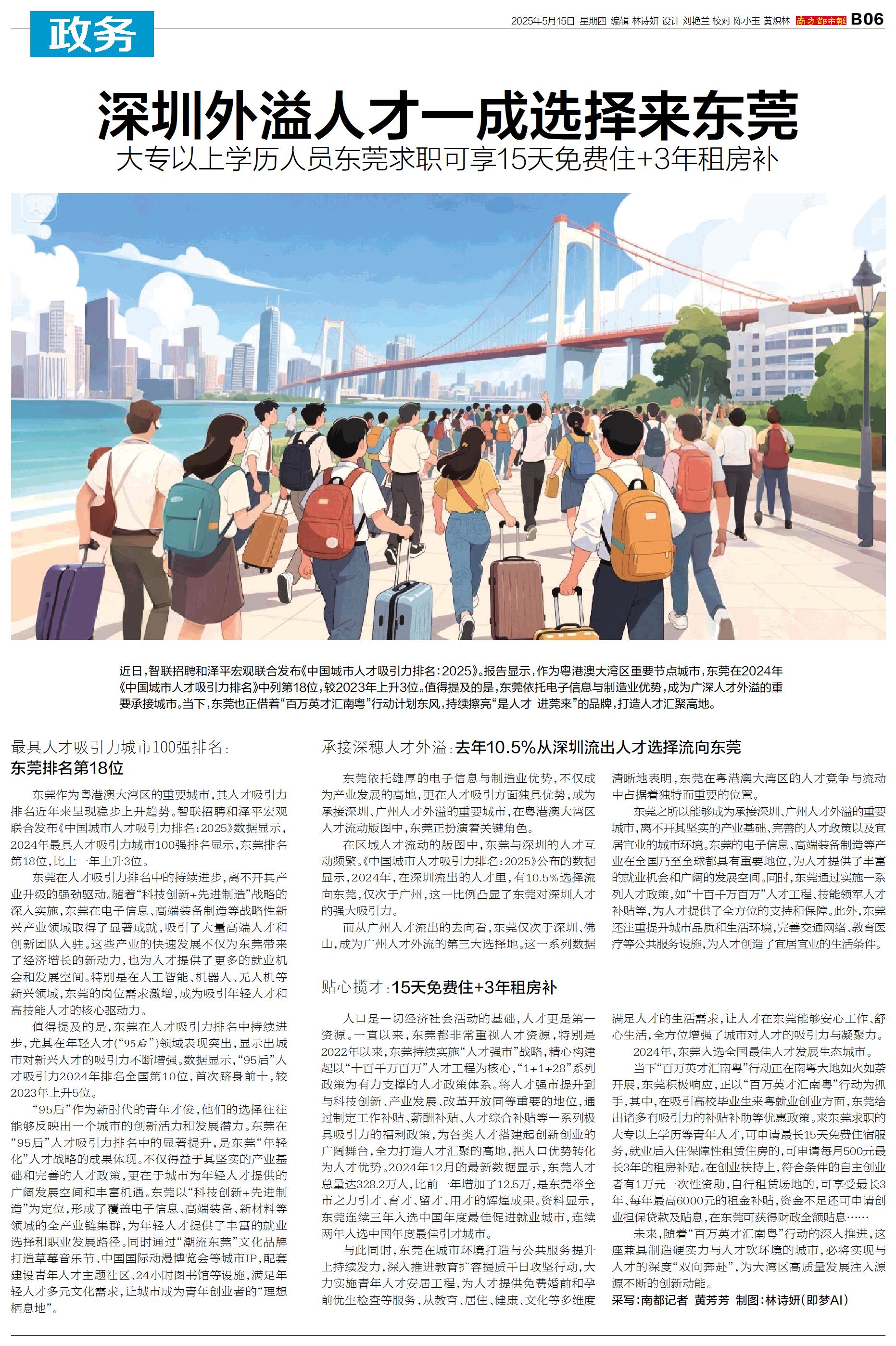 近日,智联招聘和泽平宏观联合发布《中国城市人才吸引力排名:2025》。报告显示,作为粤港澳大湾区重要节点城市,东莞在2024年《中国城市人才吸引力排名》中列第18位,较2023年上升3位。值得提及的是,东莞依托电子信息与制造业优势,成为广深人才外溢的重要承接城市。当下,东莞也正借着“百万英才汇南粤”行动计划东风,持续擦亮“是人才 进莞来”的品牌,打造人才汇聚高地。