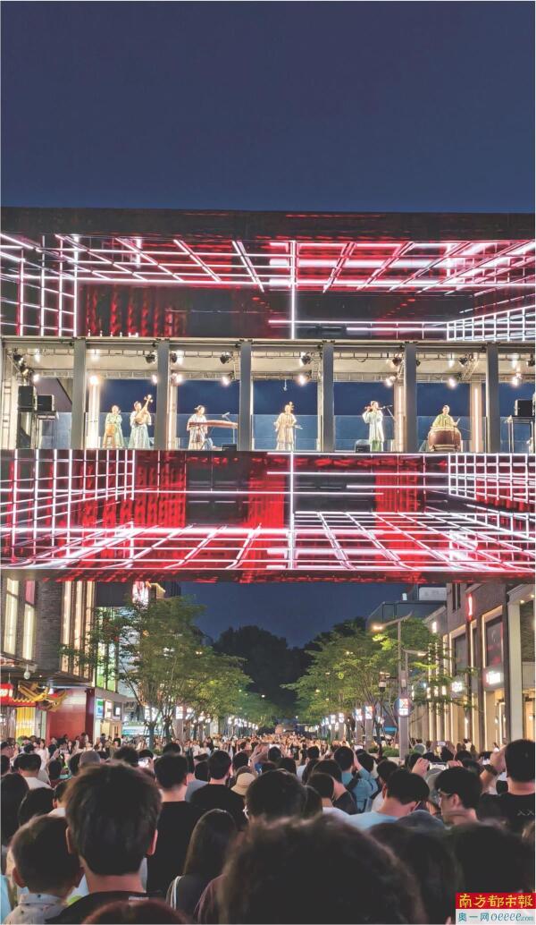 烟雨苏杭,传来声声岭南音。5月11日晚,杭州网红地标湖滨银泰in77西子廊桥下方人头攒动,东莞民族乐团在桥上奏响《可园可源》片段,独具岭南特色的旋律引得市民驻足观望。东莞原创国乐实验剧场《可园可源》先后来到苏州、杭州,将岭南的烟火气、文人气、家国情怀融进音乐和舞蹈,用机械舞美、激光成像技术等现代科技手段绘就一幅流动的画卷,讲述张敬修回乡修辟“可园”、奠定岭南画派雏形的故事,为市民游客带来耳目一新的视觉体验。