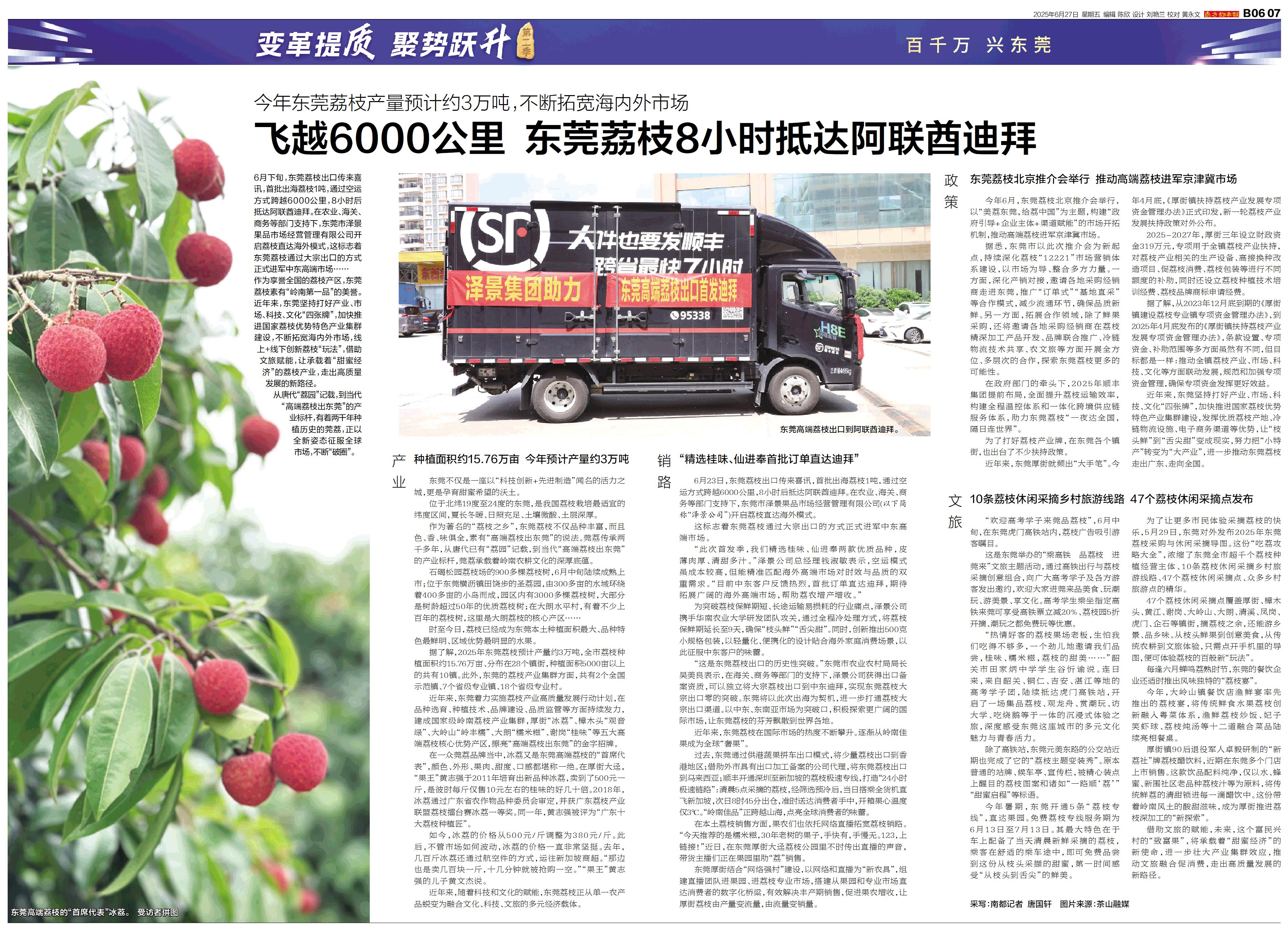 6月下旬,东莞荔枝出口传来喜讯,首批出海荔枝1吨,通过空运方式跨越6000公里,8小时后抵达阿联酋迪拜。在农业、海关、商务等部门支持下,东莞市泽景果品市场经营管理有限公司开启荔枝直达海外模式,这标
