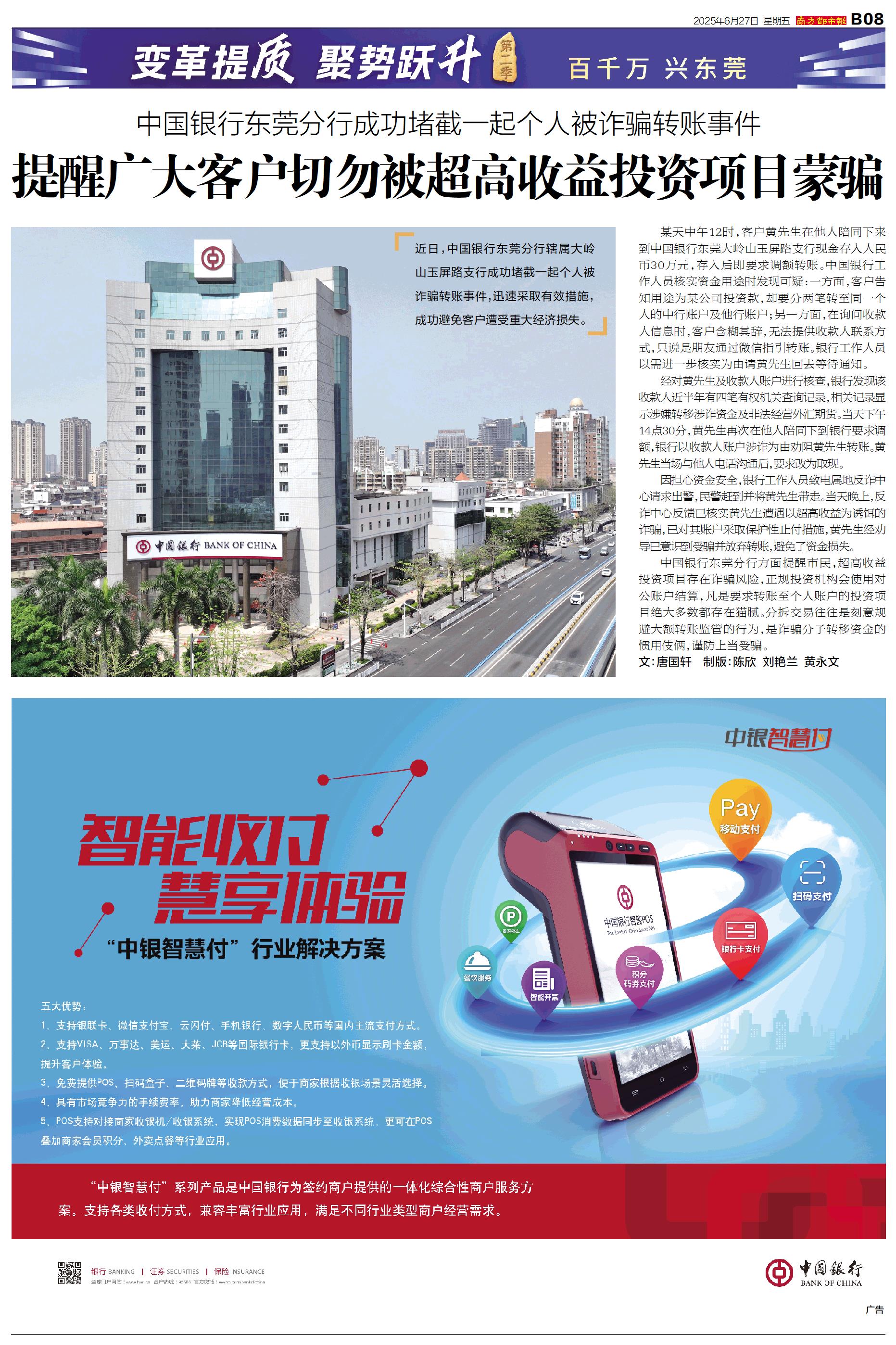 近日,中国银行东莞分行辖属大岭山玉屏路支行成功堵截一起个人被诈骗转账事件,迅速采取有效措施,成功避免客户遭受重大经济损失。 某天中午12时,客户黄先生在他人陪同下来到中国银行东莞大岭山玉屏路支行