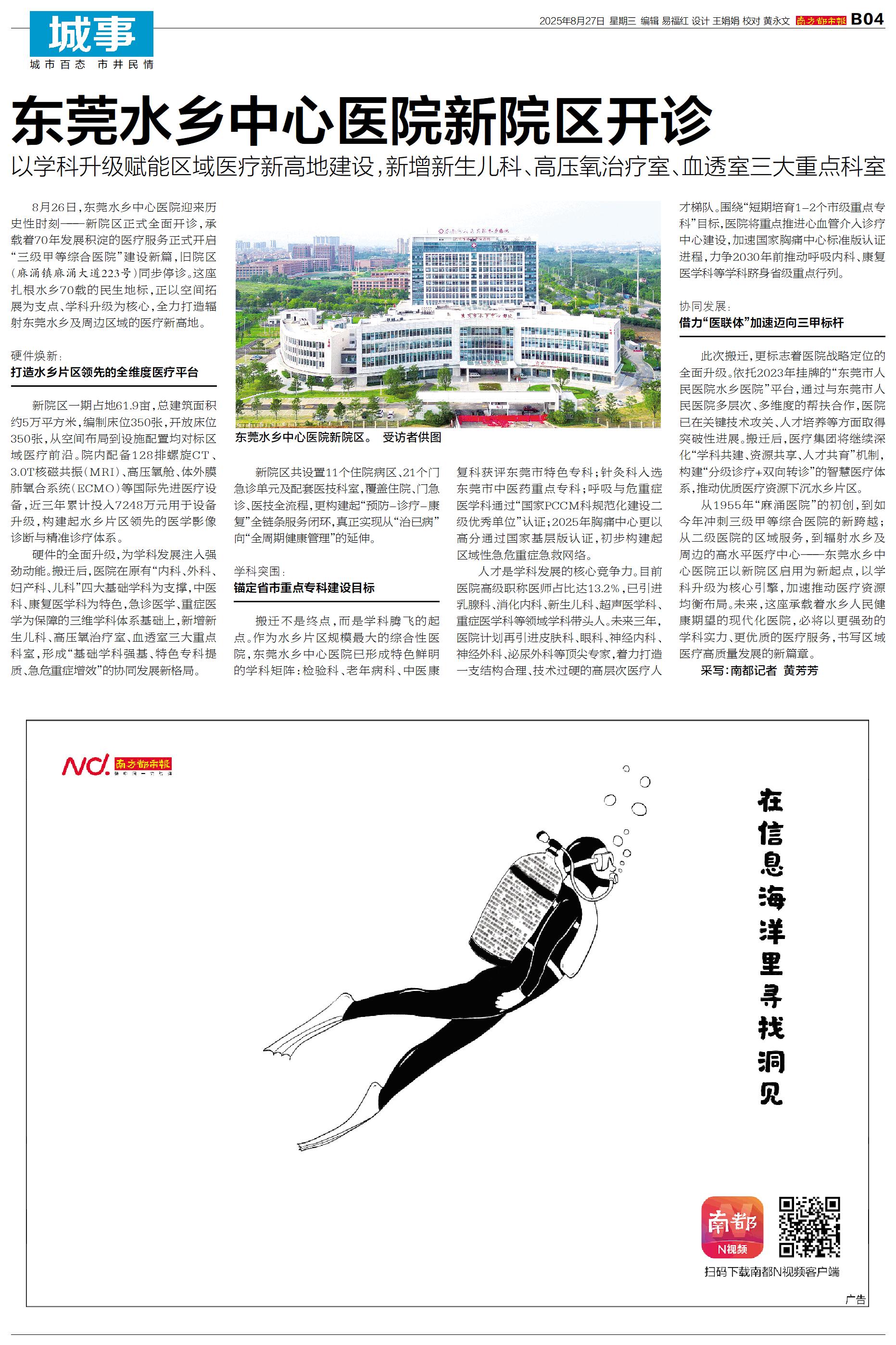 8月26日,东莞水乡中心医院迎来历史性时刻——新院区正式全面开诊,承载着70年发展积淀的医疗服务正式开启“三级甲等综合医院”建设新篇,旧院区(麻涌镇麻涌大道223号)同步停诊。这座扎根水乡70载的