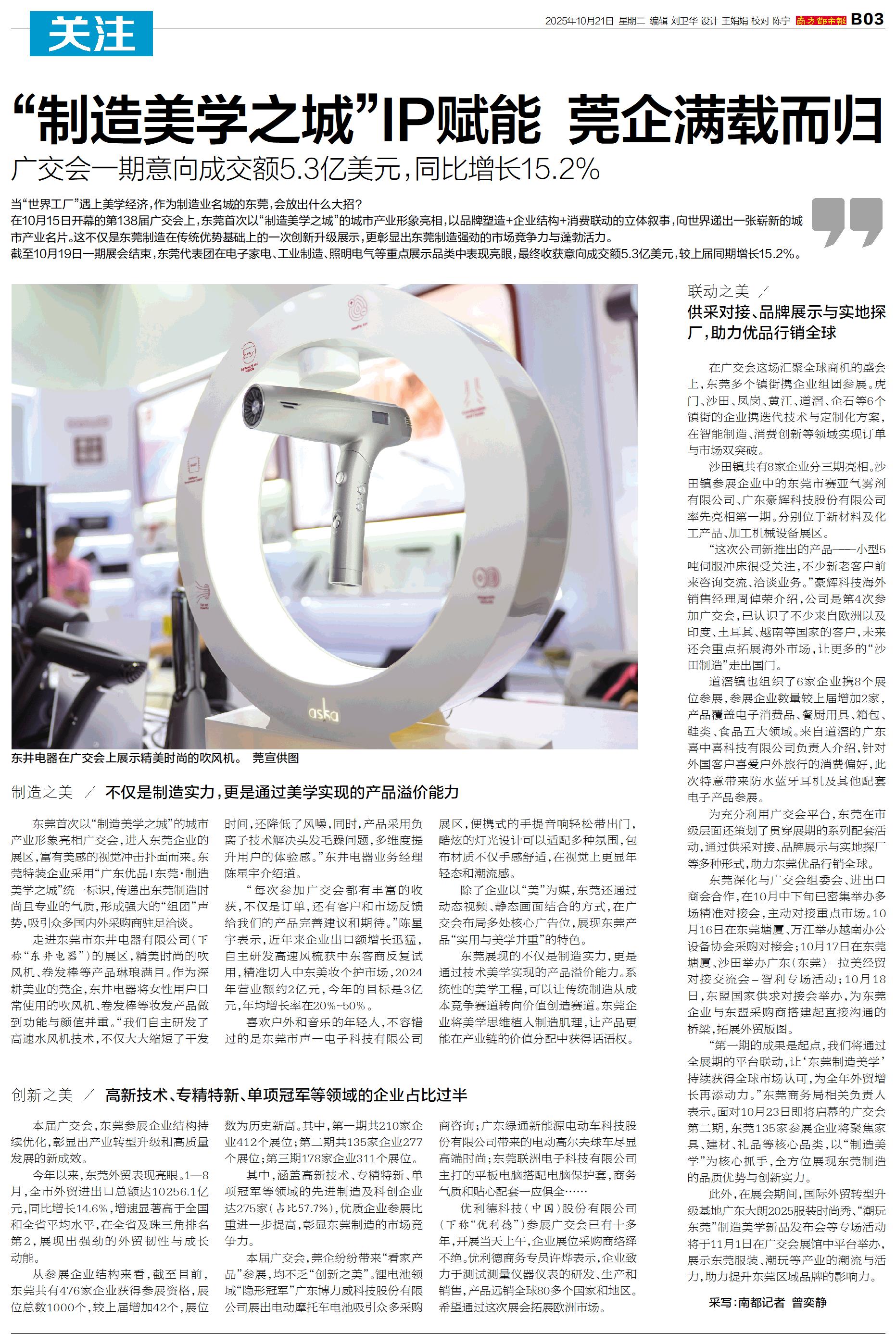 当“世界工厂”遇上美学经济,作为制造业名城的东莞,会放出什么大招? 在10月15日开幕的第138届广交会上,东莞首次以“制造美学之城”的城市产业形象亮相,以品牌塑造+企业结构+消费联动的立体叙事