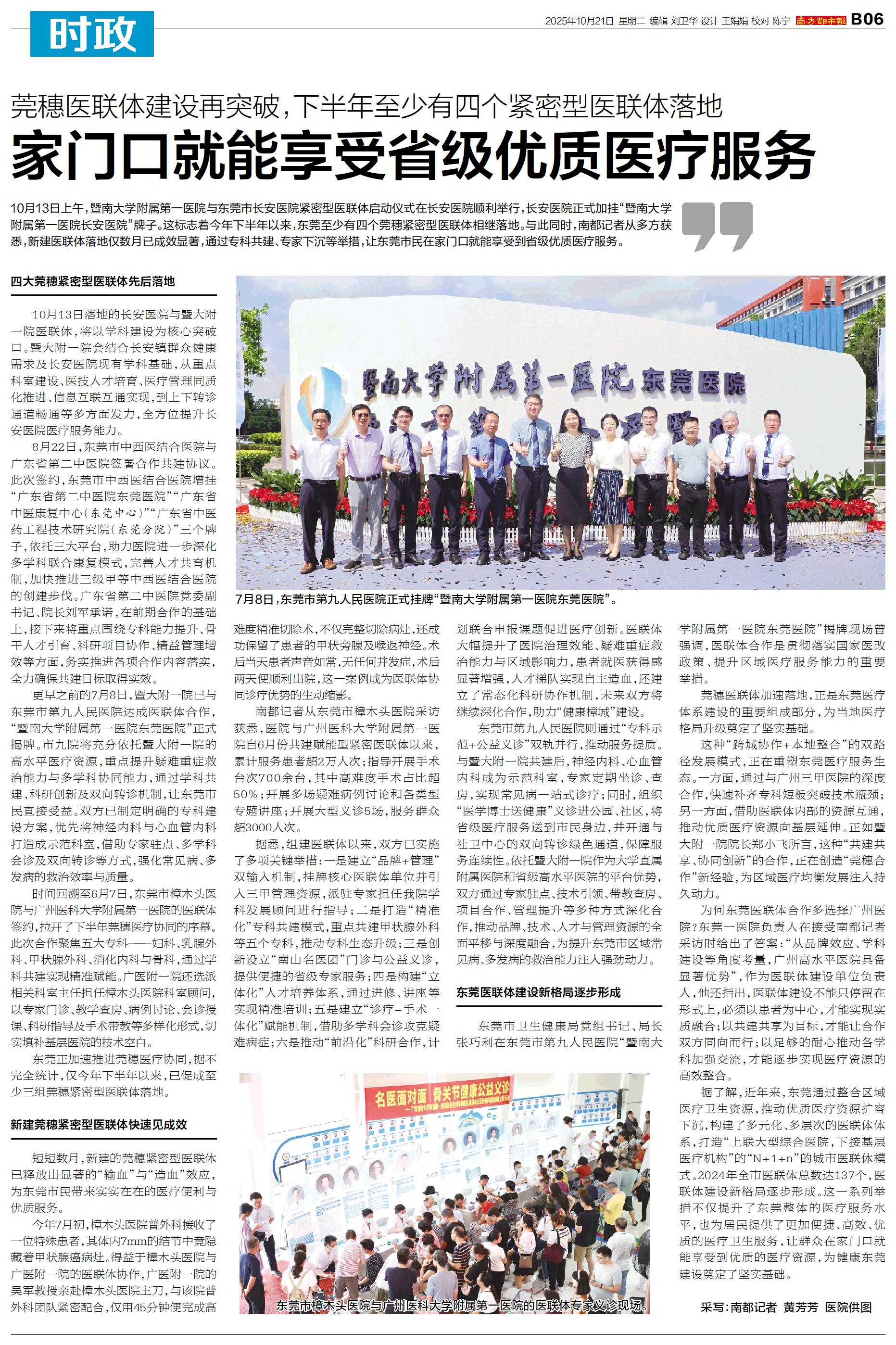10月13日上午,暨南大学附属第一医院与东莞市长安医院紧密型医联体启动仪式在长安医院顺利举行,长安医院正式加挂“暨南大学附属第一医院长安医院”牌子。这标志着今年下半年以来,东莞至少有四个莞穗紧密型