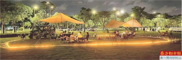 公园内草地更是都市人的“松弛感天堂”:草坪上支起的帐篷,咖啡车飘出的淡淡焦香……午后阳光斜照时,市民们带着野餐垫席地而坐,孩子们追着蝴蝶奔跑……午后,市民铺着野餐垫闲坐,孩子追着蝴蝶奔跑;夜幕降临,帐篷暖光与星光交织,咖啡车的忙碌身影被暖黄灯光勾勒,虫鸣、晚风与偶尔掠过的列车灯……正如一位市民所说:“南城将军洲真的很美好,坐那什么都不做,感觉很松弛、很治愈”。