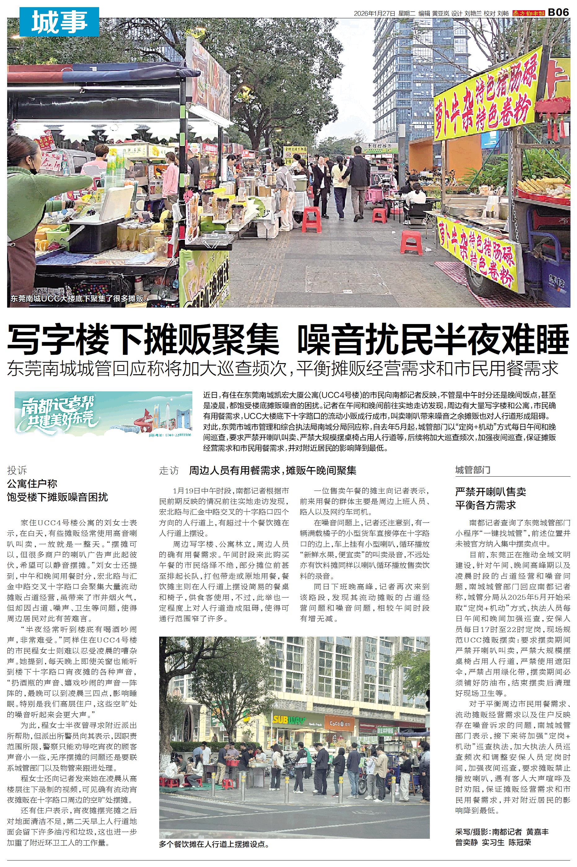 近日,有住在东莞南城凯宏大厦公寓(UCC4号楼)的市民向南都记者反映,不管是中午时分还是晚间饭点,甚至是凌晨,都饱受楼底摊贩噪音的困扰。记者在午间和晚间前往实地走访发现,周边有大量写字楼和公寓,市