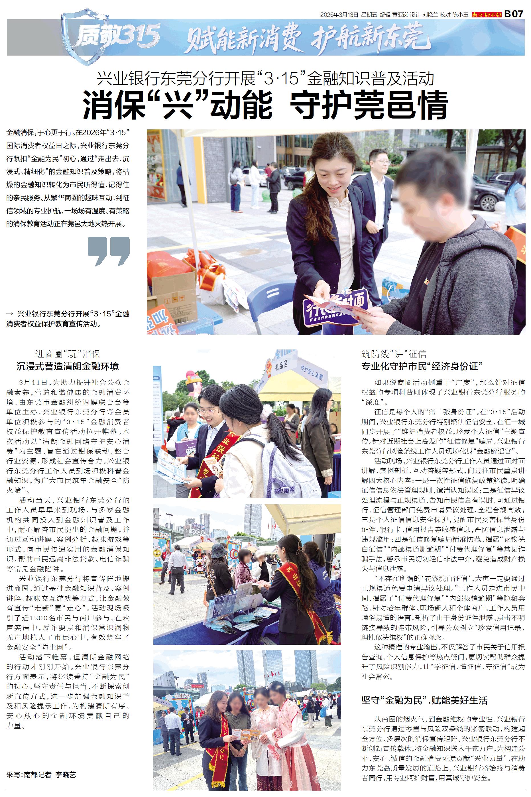 金融消保,于心更于行。在2026年“3·15”国际消费者权益日之际,兴业银行东莞分行紧扣“金融为民”初心,通过“走出去、沉浸式、精细化”的金融知识普及策略,将枯燥的金融知识转化为市民听得懂、记得住