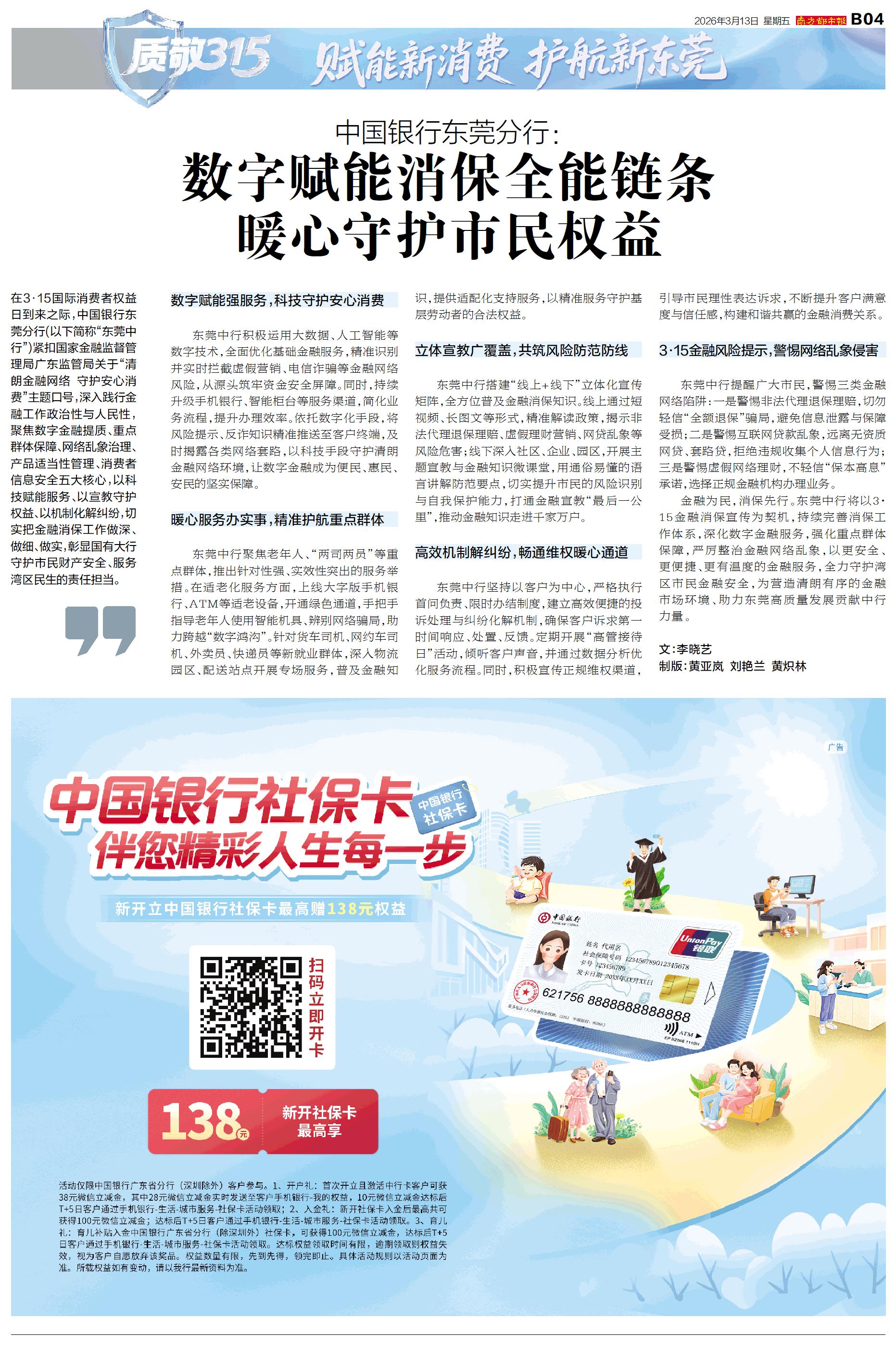 在3·15国际消费者权益日到来之际,中国银行东莞分行(以下简称“东莞中行”)紧扣国家金融监督管理局广东监管局关于“清朗金融网络 守护安心消费”主题口号,深入践行金融工作政治性与人民性,聚焦数字金融