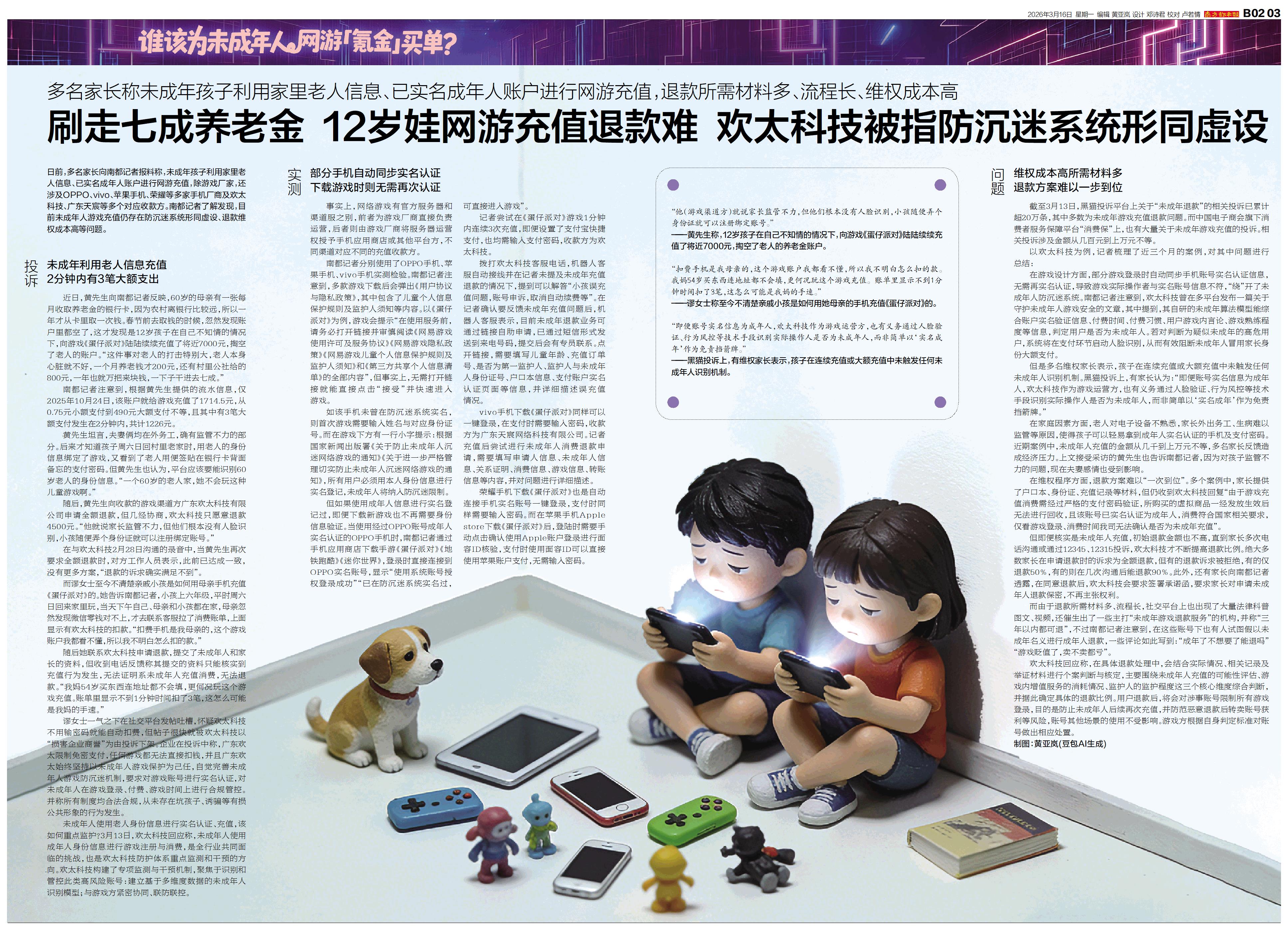 制图:黄亚岚(豆包AI生成) 日前,多名家长向南都记者报料称,未成年孩子利用家里老人信息、已实名成年人账户进行网游充值,除游戏厂家,还涉及OPPO、苹果手机、荣耀等多家