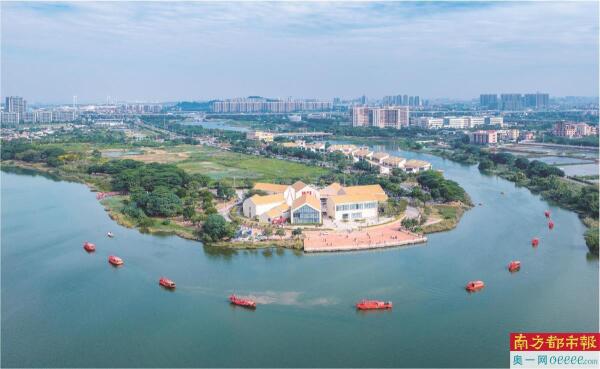 依托28公里黄金海岸线与34条美丽河湖,沙田镇大力发展“水经济”。图为水上婚礼船只驶过穗丰年水道的疍家文化艺术中心。 叶瑞和 摄