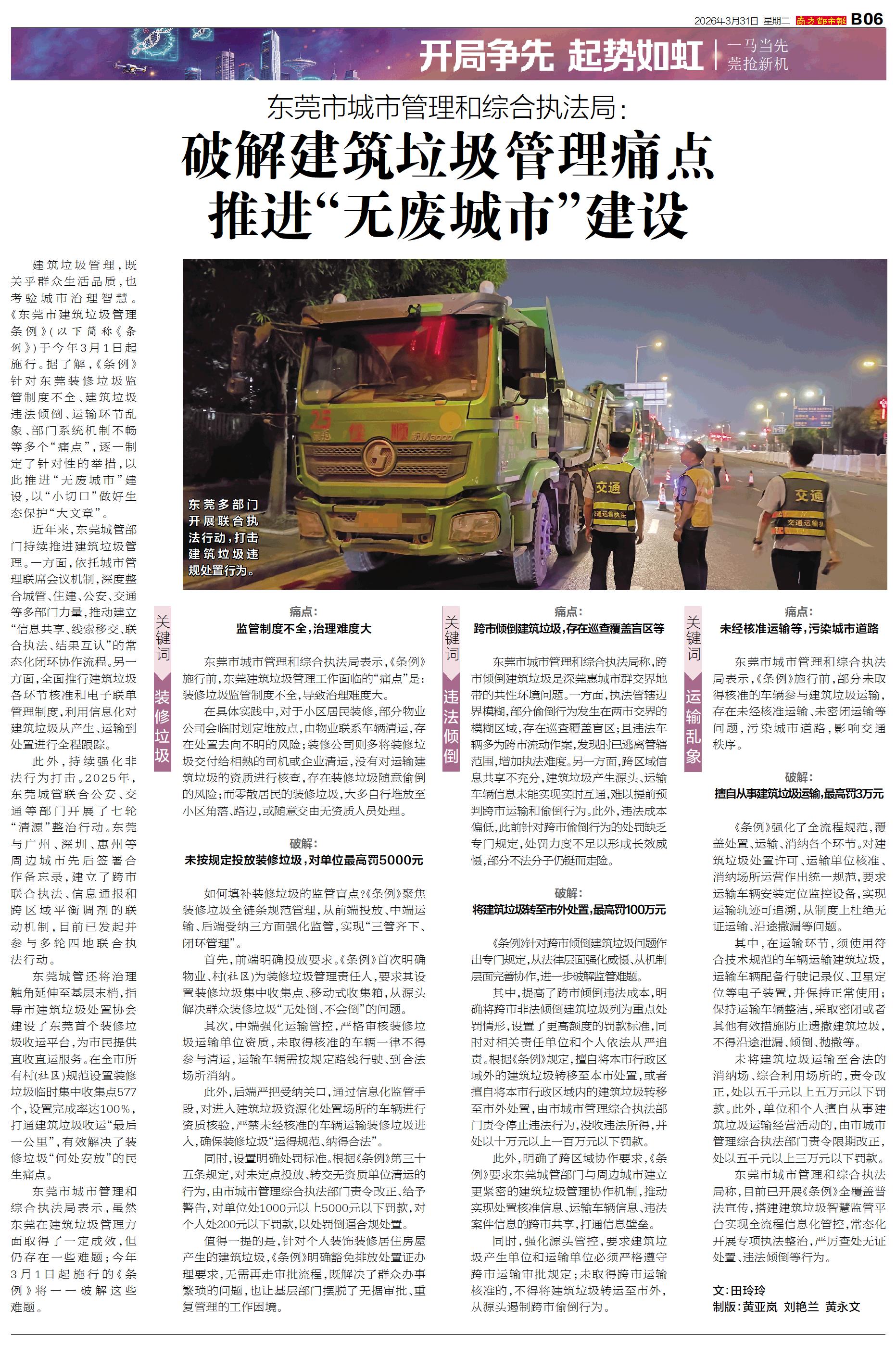 建筑垃圾管理,既关乎群众生活品质,也考验城市治理智慧。《东莞市建筑垃圾管理条例》(以下简称《条例》)于今年3月1日起施行。据了解,《条例》针对东莞装修垃圾监管制度不全、建筑垃圾违法倾倒、运输环节乱