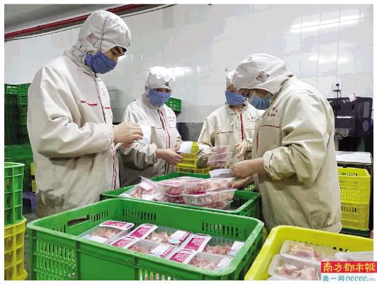 3月11日,在位于惠东白花的惠州东进农牧股份有限公司冷藏室与包装间,几名工人正忙碌给分割好的猪肉打包。该公司何燕航副董事长向南都记者介绍,作为重点生活物资保障名单制企业,疫情期间向银行申请了3000万元纯信用贷款,没想到很快就审批通过。“与平日相比,这笔纯信用贷款的利息总共优惠了40%,等着这笔款到账,就能用于扩大生产规模,保障惠州猪肉供给量。”