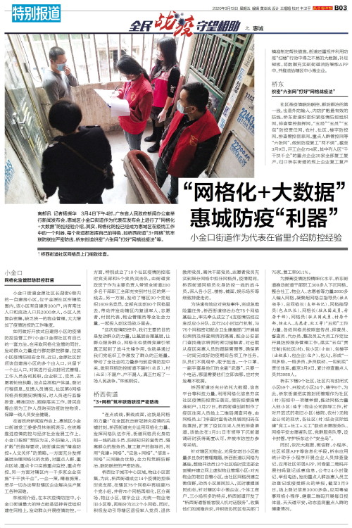 南都讯 记者杨振华 3月4日下午4时,广东省人民政府新闻办公室举行新闻发布会,惠城区小金口街道作为代表在发布会上进行了“网格化+大数据”防控经验介绍。其实,网格化防控已经成为惠城区在疫情工作中的一个利