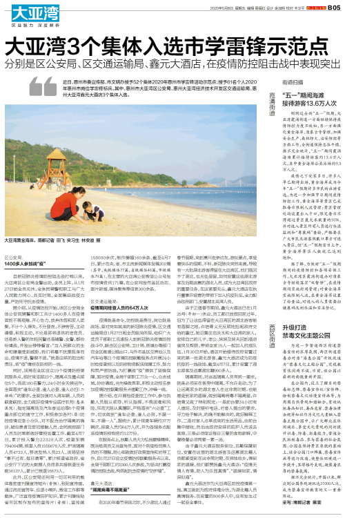 近日,惠州市委宣传部、市文明办授予52个集体2020年惠州市学雷锋活动示范点;授予61名个人2020年惠州市岗位学雷锋标兵。其中,惠州市大亚湾区公安局、惠州大亚湾经济技术开发区交通运输局、惠州大亚湾鑫