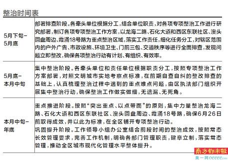 根据方案,此次专项整治工作以户外广告、市政设施、环境卫生、“门前三包”、交通秩序为重点内容,重点整治龙海二路、石化大道和西区东联社区、澳头圆盘周边、霞涌18号路等区域。