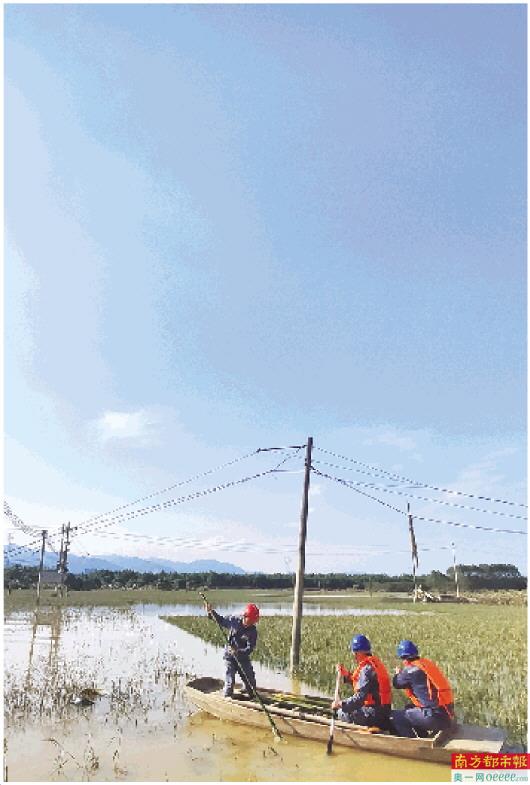 龙门县永汉镇合口围村的洪水还没有退去,稻田里的禾苗都还被水淹着。原本的陆地变成了一片泽国,供电施工人员只能撑着小船去检修供电设施。