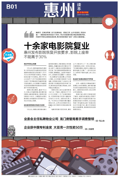 南都讯 记者黎秀敏 实习生蔡晓佳 佩戴口罩、出示粤康码、测量体温……受疫情影响关闭近6个月后,7月20日起惠州部分电影院重新开放。市民终于有机会重新走进影院,再次看到熟悉的“龙标”,听到久违的前奏。观